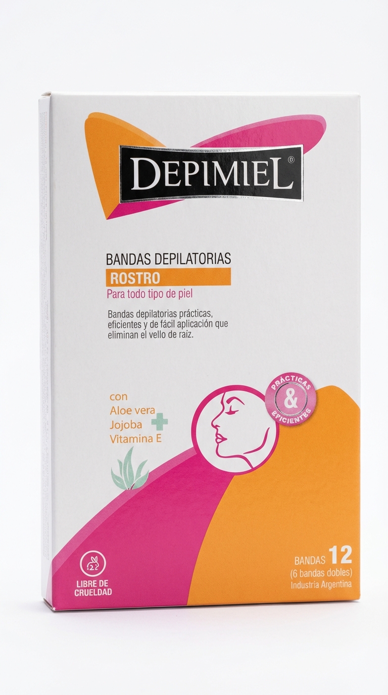 Descubrí las DEPIMIEL Bandas Depilatorias Rostro x12 Todo Tipo de Piel, unas bandas depilatorias faciales listas para usar diseñadas para eliminar el vello del rostro de manera rápida y eficaz, aptas para todo tipo de piel.