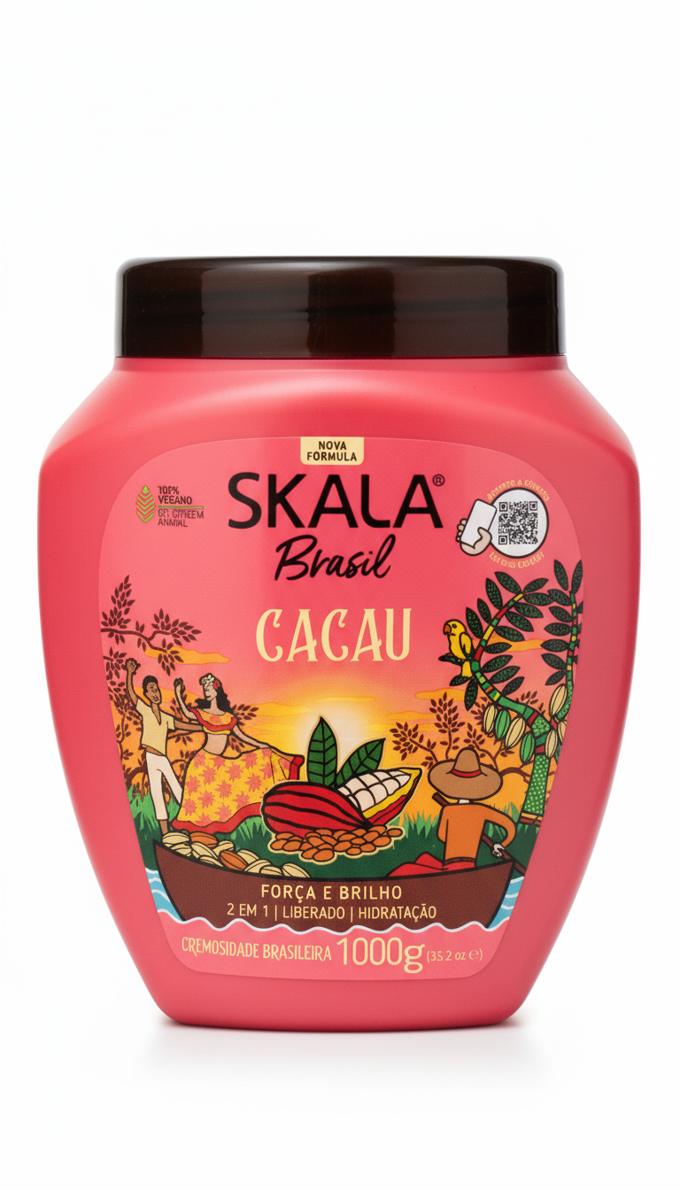 Envase de 1 kg de baño de crema Skala Cacau, pensado para acompañar tu rutina de cuidado capilar con un tratamiento nutritivo e hidratante que deja el cabello más suave, revitalizado y con un acabado luminoso.