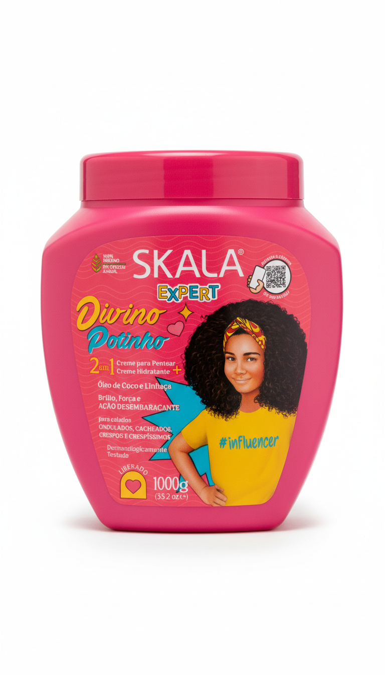 Envase de 1 kg de baño de crema Skala Divino Potinho, pensado para integrarse en tu rutina de cuidado capilar con un tratamiento nutritivo e hidratante que deja el cabello más suave, fuerte y con un aspecto luminoso y saludable.