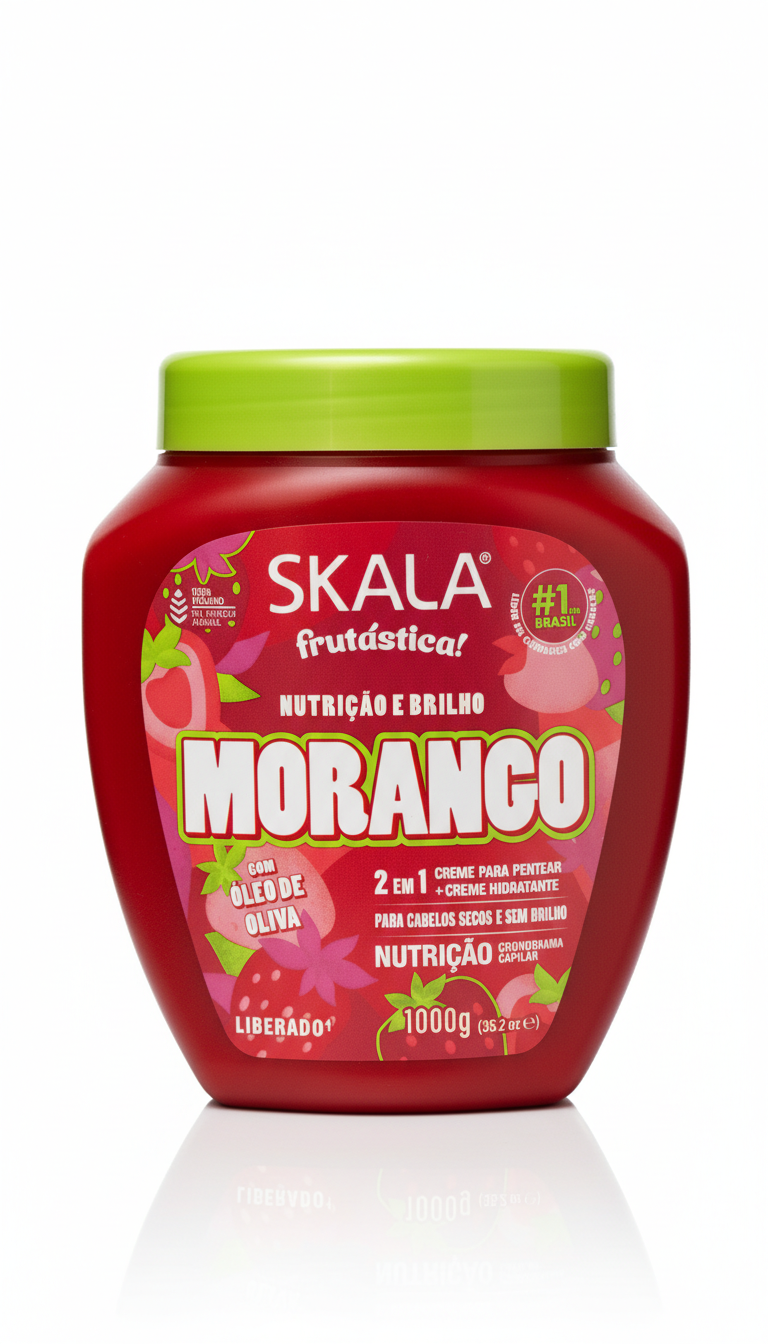 Envase de 1 kg de baño de crema Skala Morango, pensado para acompañar tu rutina de cuidado capilar con un tratamiento nutritivo, hidratante y sensorial, dejando tu cabello más suave, revitalizado y con un acabado luminoso.