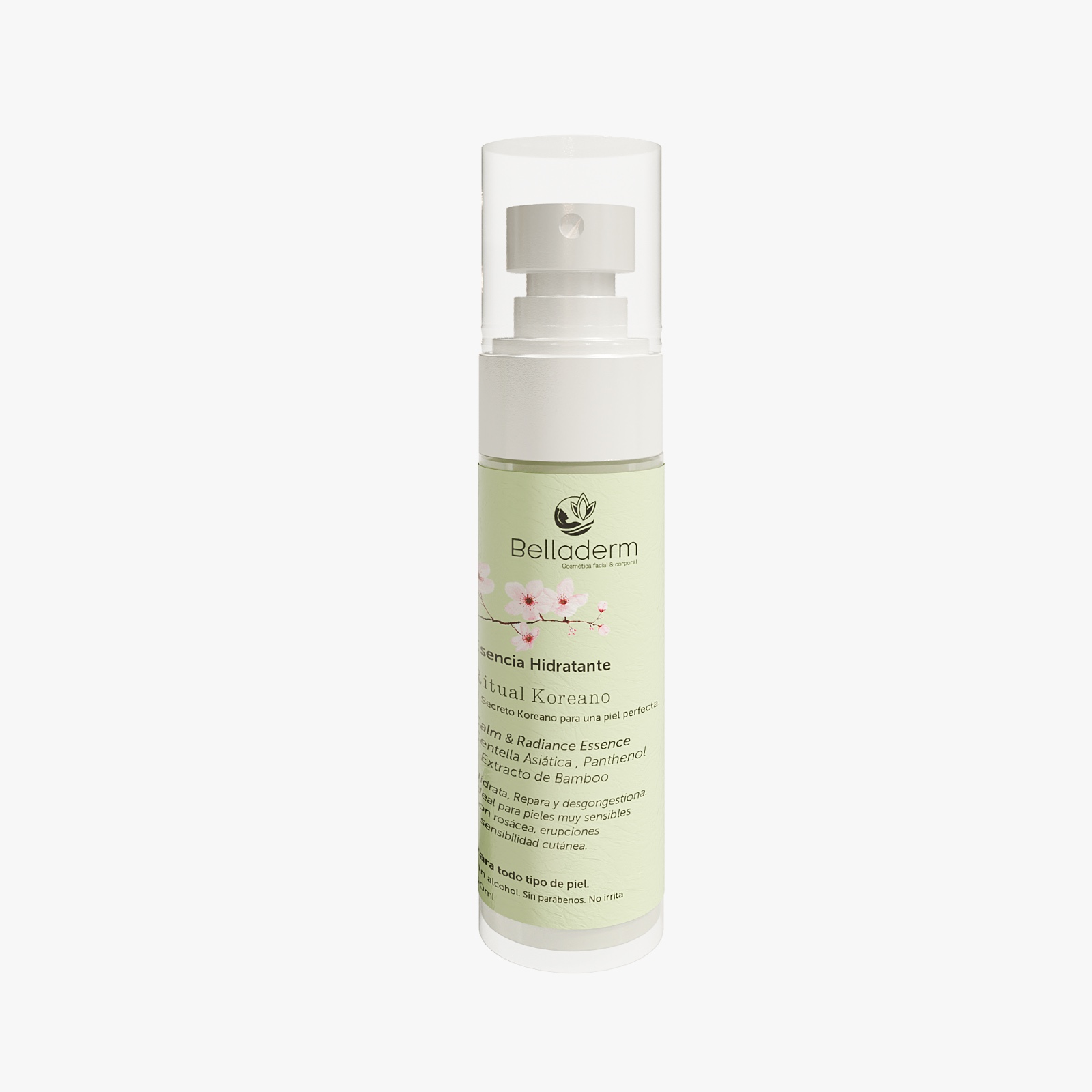 Envase con atomizador de Belladerm Esencia Hidratante Ritual Koreano Calm & Radiance Essence, ideal para complementar la rutina diaria de cuidado facial y mantener la piel hidratada, calmada y luminosa.