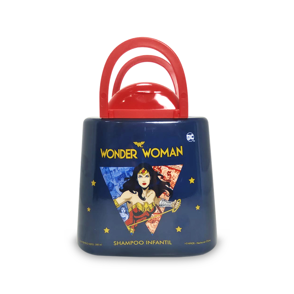 Envase 300 ml – Carterita Wonder Woman – formato familiar y práctico, ideal para el uso diario en casa 🛁🦸‍♀️✨.